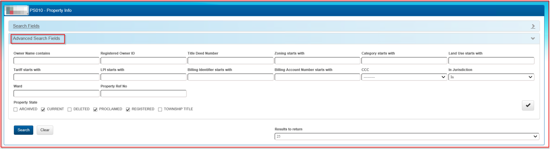 It may at times be necessary to insert some more extensive information so as to obtain the property details. In those cases use the 'Advanced Search Fields' function. This can be expanded to see additional fields which could optionally be searched on. If a property is not being displayed, it may be necessary to select additional fields for Property Type or Property Status.