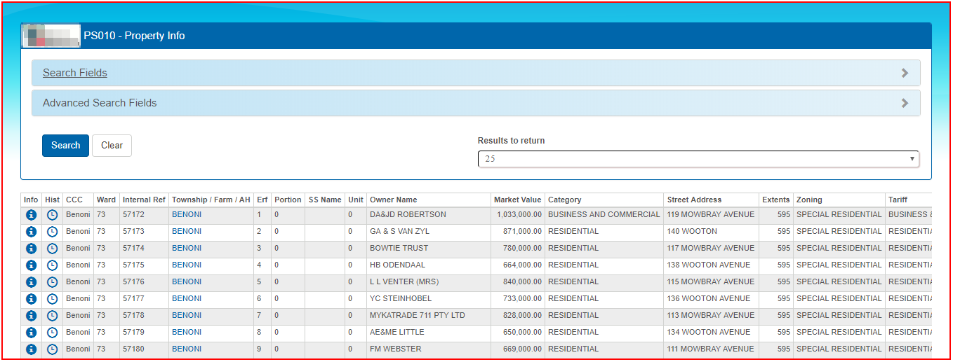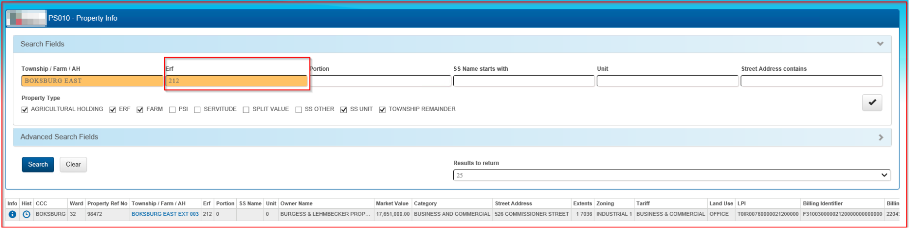 Note: A search can be done on any one field. For Example; if the Township name is not available, then a search in the Erf only field will return results. If the Erf number is not available and the Township is, then search in the Township field only.