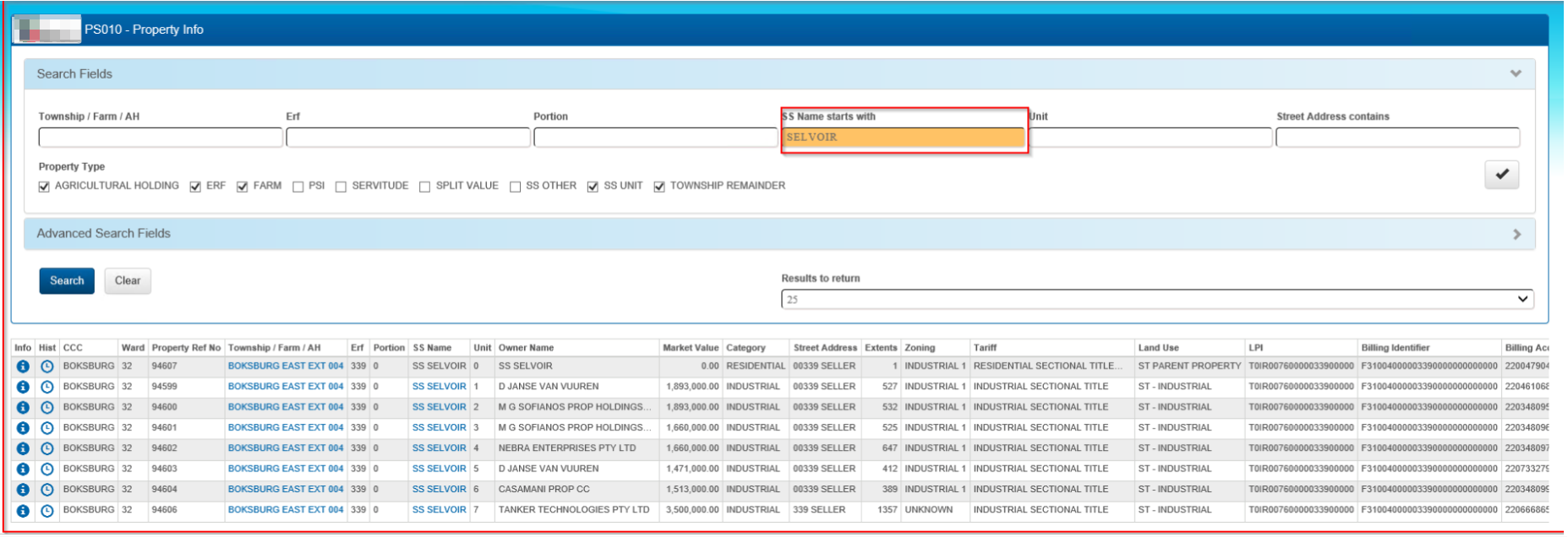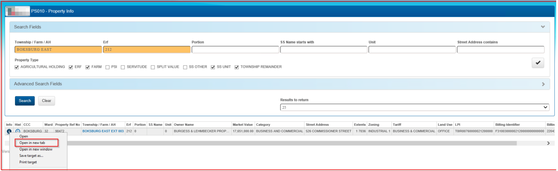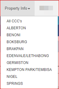 Property searches can be limited to a specific Customer Care Centre (CCC). On the menu at the Property Info menu at the top, select the required CCC.