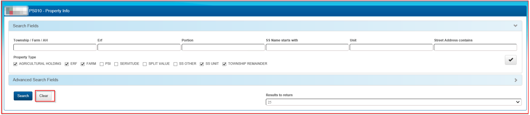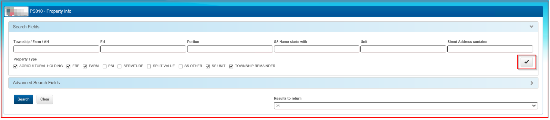 The Property Info page has 9 check boxes, when LIMS is opened the following boxes are automatically checked: Agricultural Holdings; ERF; Farm; SS Unit; Township Remainder. To clear these checked boxes and personalize the search, select the tick box on the far right of the screen. The result will clear the checked boxes, select the required fields you want to search only.