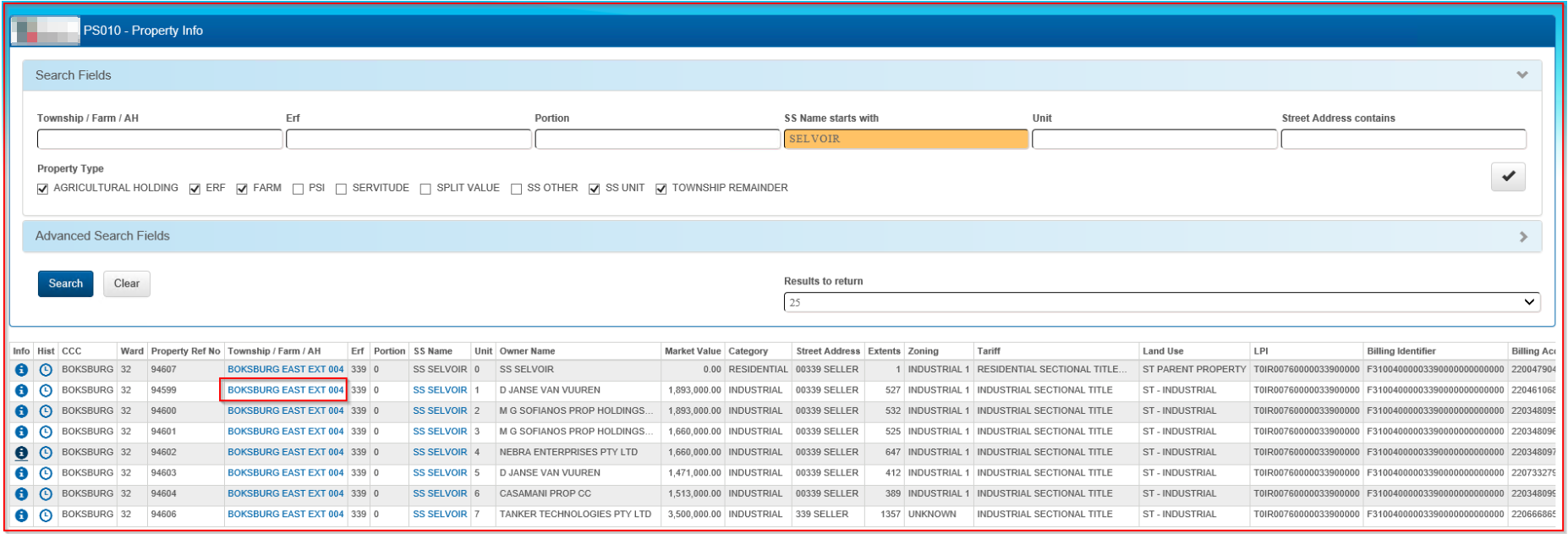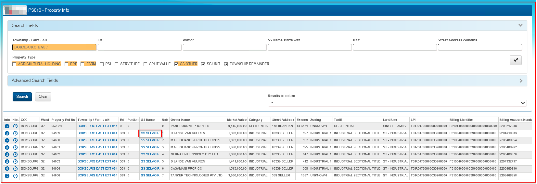 Below are results from an Advanced Search. Scroll through the list of properties and select the correct property.