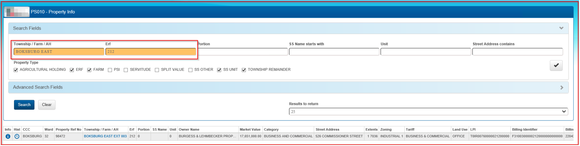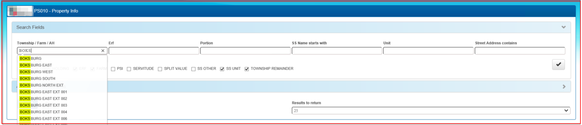 If the Township/Farm or AH(Agricultural Holding) is unknown, insert the Erf number into the Erf field and select 'Search'. The returned results will reflect all Erven with that number and then the required Township/Farm or AH (Agricultural Holding) can be selected.
