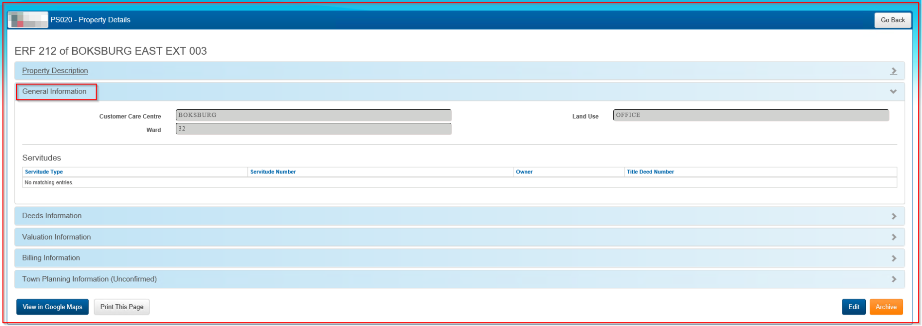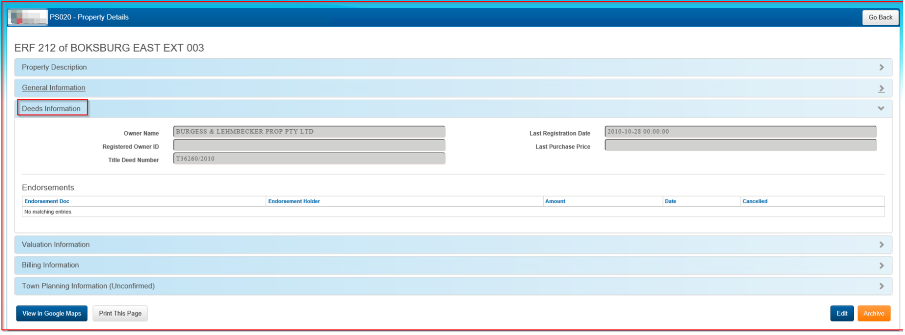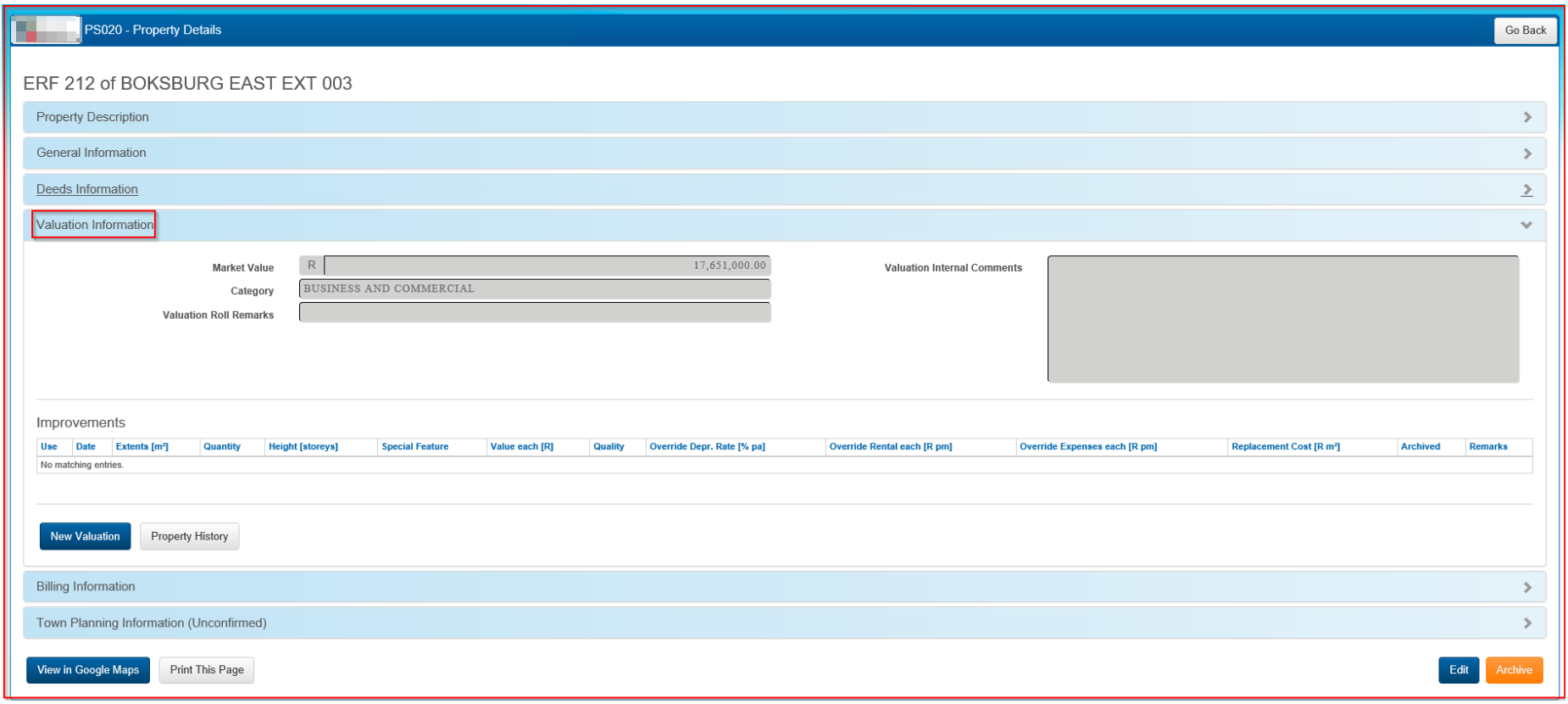 Note: At the installation of the system, the GIS coordinates, as publicly available from the Surveyor General, will be pre-loaded. However, these will not be updated until such time as integration with the municipal GIS is in place. Therefore, the 'View in Google Maps' option will not be available for new properties.