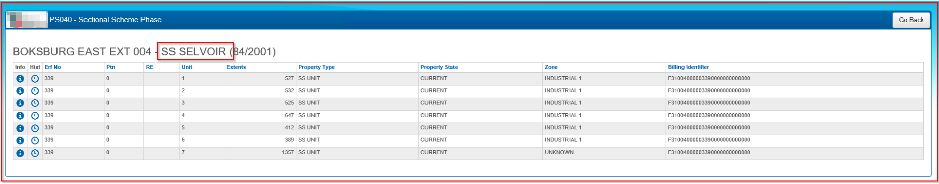The search results will reveal all the Sectional Scheme phases with the same name along with their corresponding Unit Numbers.